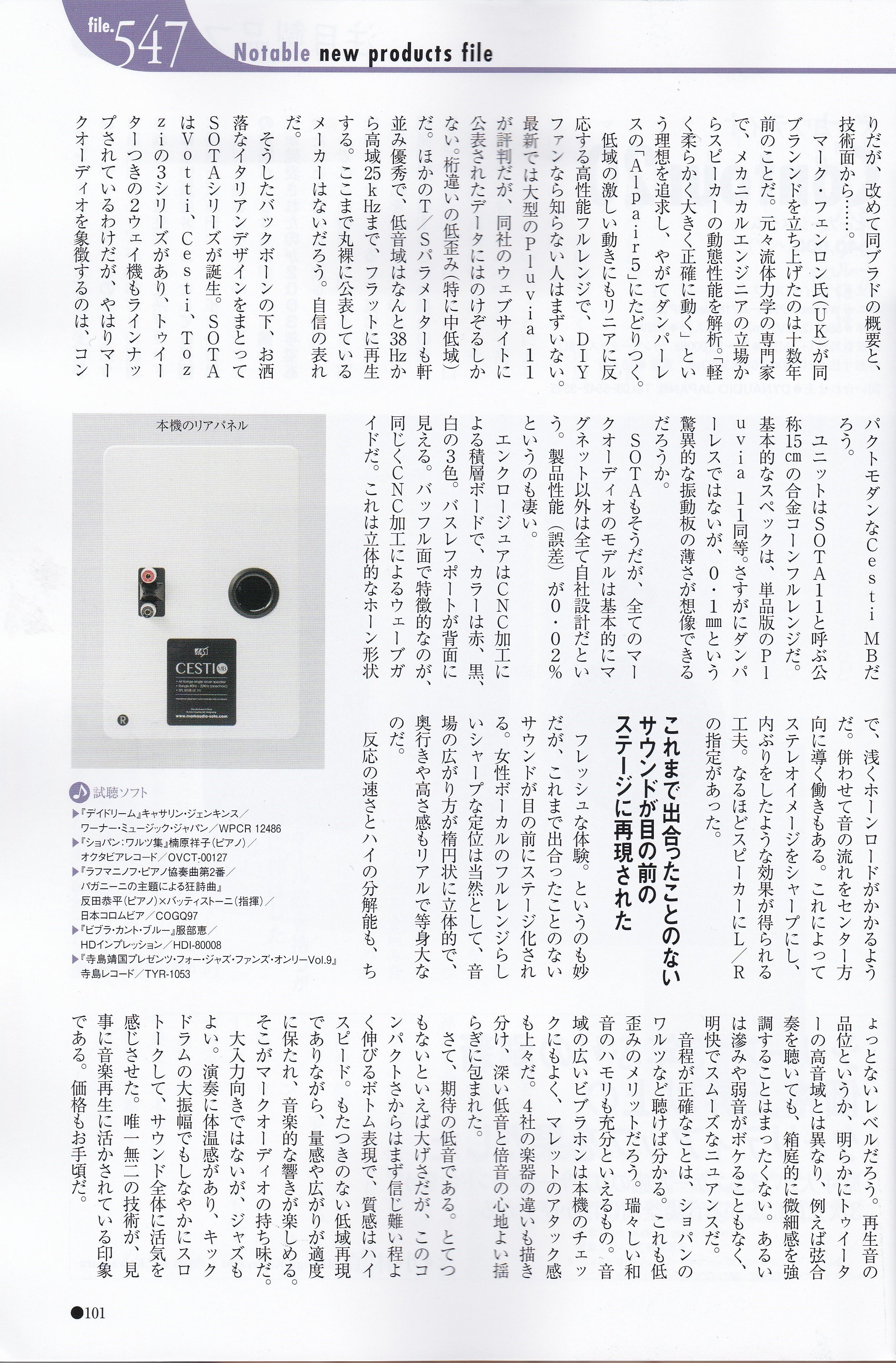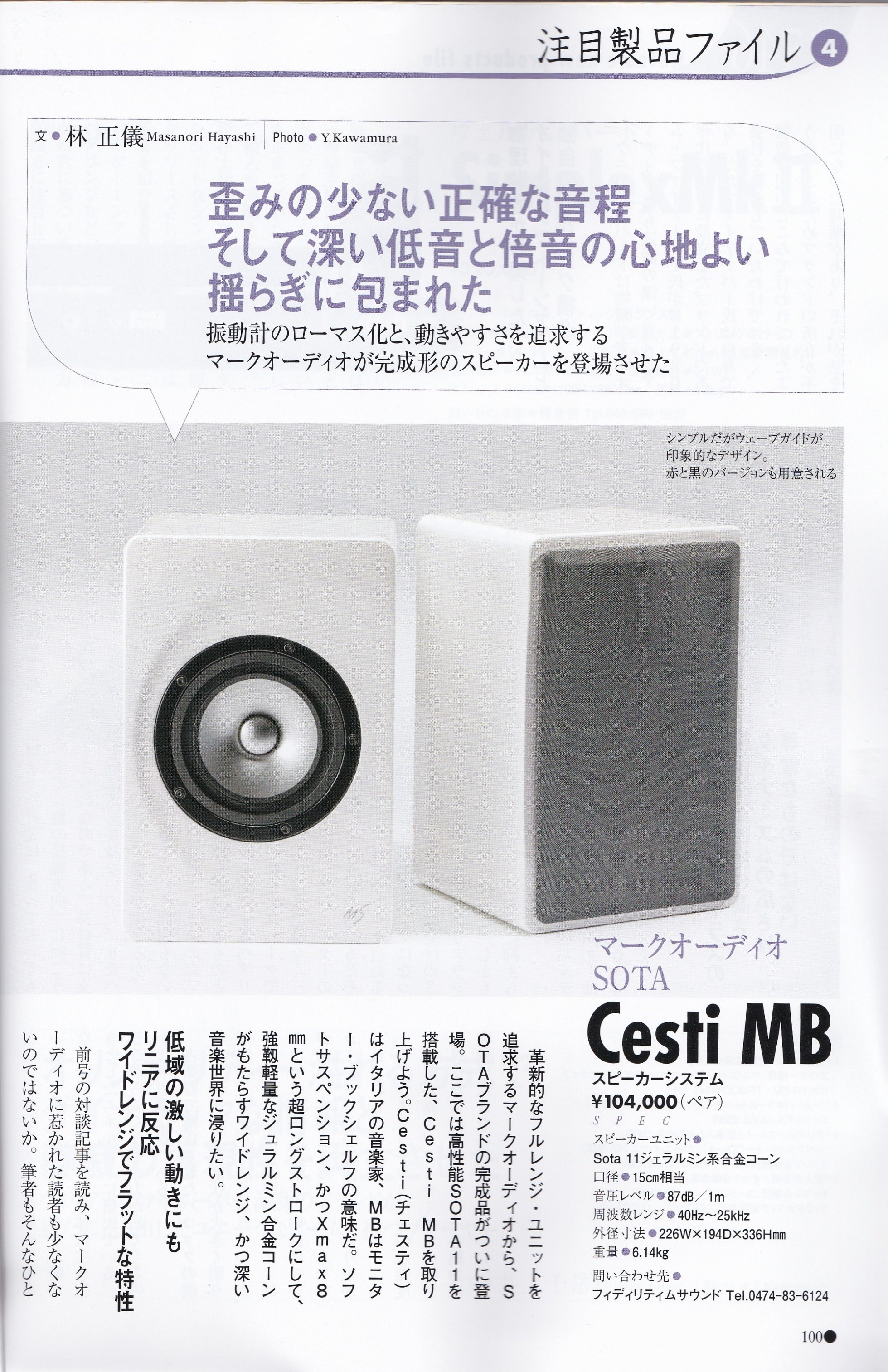 ステレオ誌や評論家の皆さまに絶賛された高性能エンジンSOTA11®を搭載し本格的な音楽ファンに十分ご満足いただける高音質モデルです。エンクロージャーの各パネルは可聴共鳴を避けるためにパネルの剛性と質量が慎重に検され、歪感が極端に少ないSota11の性能を100%引き出すスタビリティの高いプラットフォームを提供しています。 フロントバッフルのデザインは独特のシャローウェーブガイドが内側に向け左右対称にデザインされています。これは点音源から発生する音波が左右のスピーカーの間に立体的に合成させるように配慮されており、独特なリアル感・ホール感や楽器の位置感が得られます。
